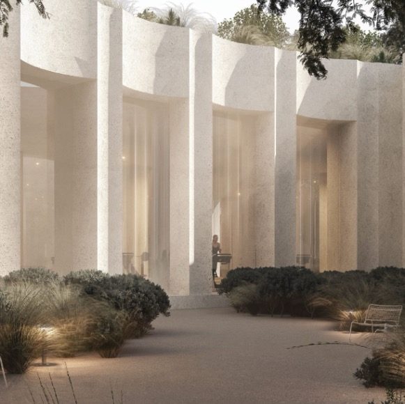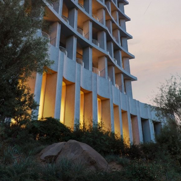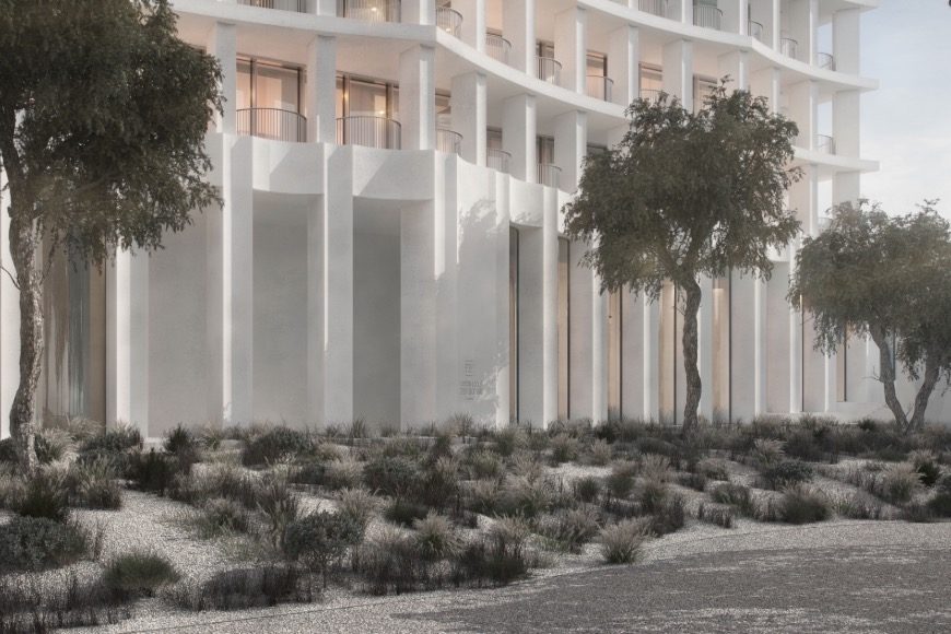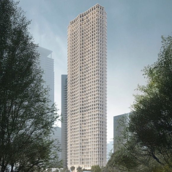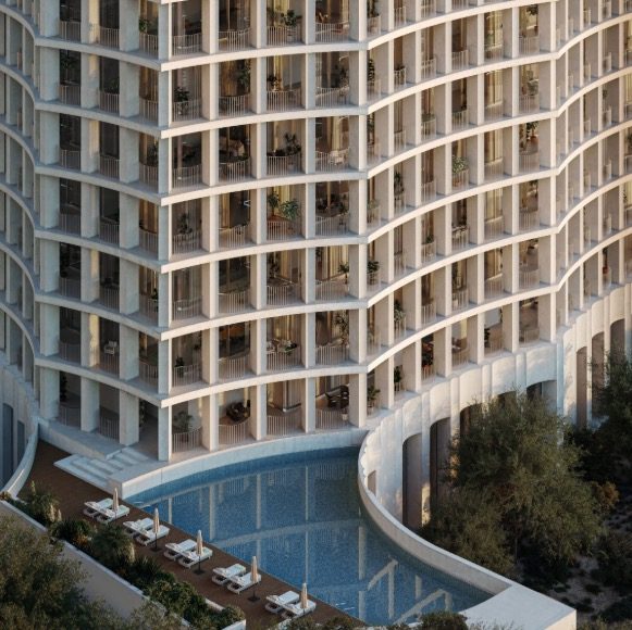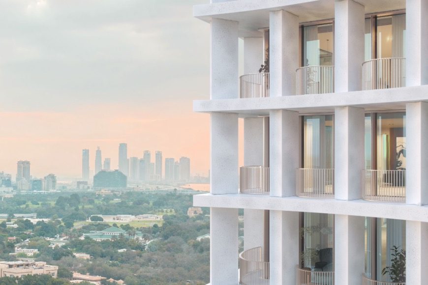 Designed by DXB Lab with interiors by Tristan Auer, the project combines high ceilings, full-height glazing, premium surfaces, and textured façade geometry inspired by natural elements.